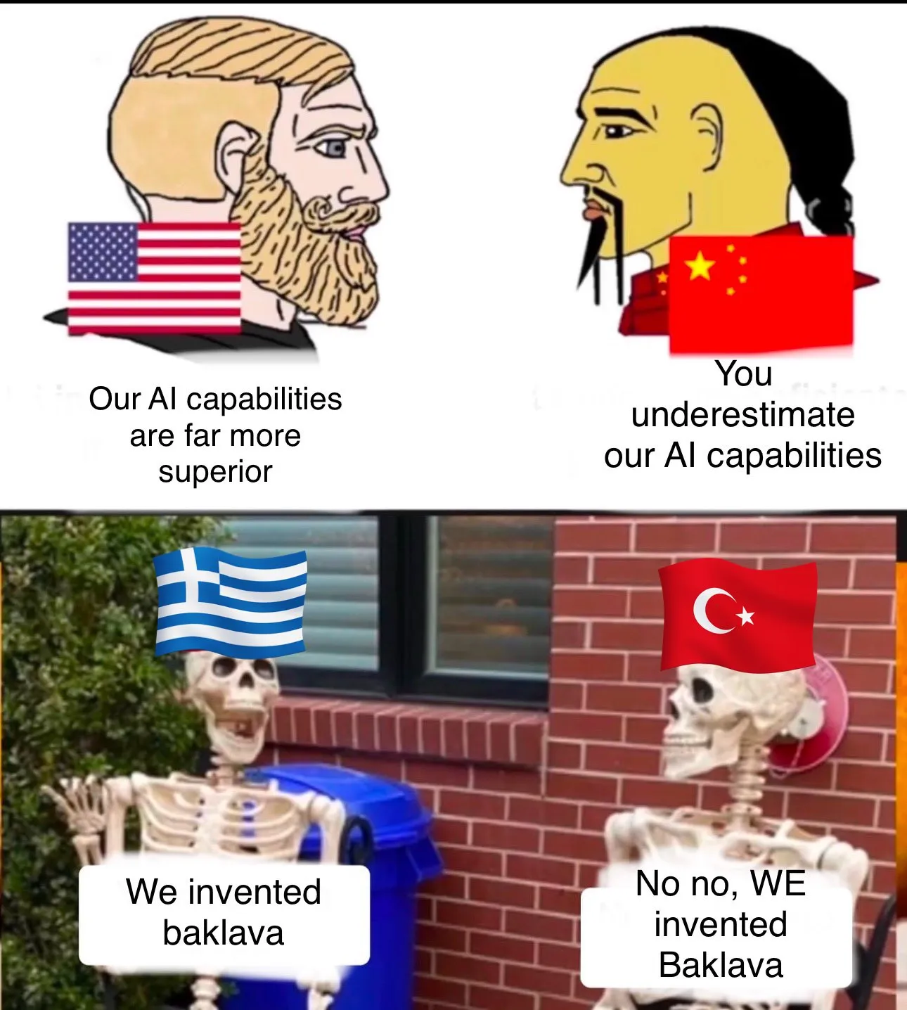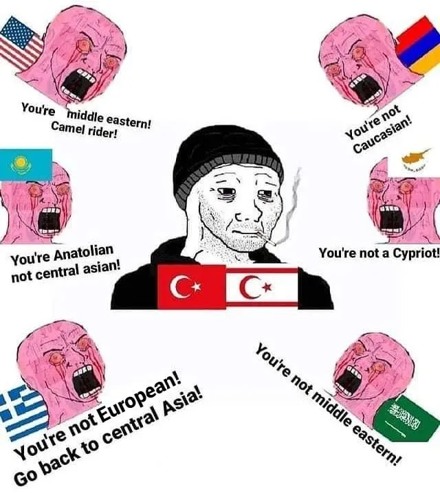 ABD ve Çin teknolojik gelişmeleri sürdürürken geçmişin başarılarına takılı kalan Yunanistan ve Türkiye temsiliGenel olarak, Türk kimliğinin göreli ve ilişkisel doğası; düşman, dost veya rakip, üstün veya aşağı olarak sunulan diğer dış grup kimliklerin sıkça temsil edildiği mimlerde yaygın olarak gözlemlenebilir. Örneğin, Türk kimliği bazen Yunan'ın başlıca tarihsel düşmanı olarak karşısına, bazen de benzer kültür ve yaşayışa referans verilip yakın komşusu olarak yanına konumlandırılabilmektedir. Bunun yanı sıra, görelilik zamansal bir yerden okunup, milliyetçilik ve tarihsel yüceltme anlatıları ile (Bunlar mim üreticisinin ideolojisine bağlı olarak, büyük Orta Asya mirası, Osmanlıların yakın imparatorluk geçmişi veya Cumhuriyet'in ilk dönemleri gibi farklı türlerde karşımıza çıkabilir) güncel ekonomik, siyasi veya toplumsal düzeyde gerileme durumu arasında bir çatışma olarak da karşımıza çıkabilmektedir.